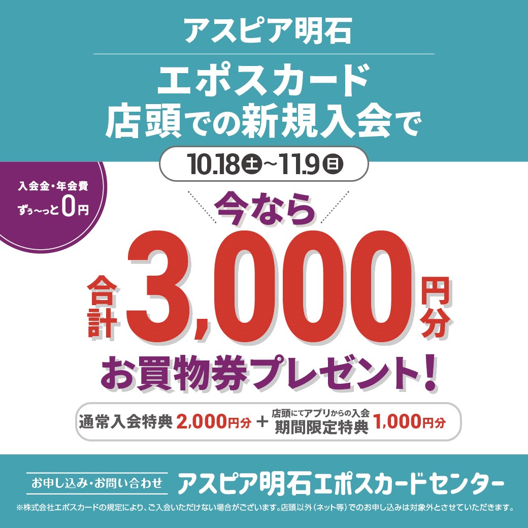 期間中、アスピア明石エポスカードセンター店頭にてエポスアプリから新規ご入会いただくと、通常の新規ご入会特典(2,000円分のアスピア明石エポスカードお買物券)に加え、1,000円分のお買物券をプレゼントいたします。